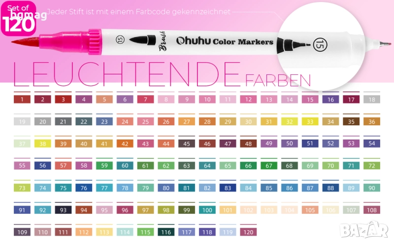 Ohuhu Maui Series маркери с два писеца тип четка и тънък писец, Ohuhu 120 цвята, с мастило на водна основа, смесваеми цветове, четка и тънкописец с фин връх, идеални за рисуване, калиграфия, рисуване на манга, планиране, дневници, изобразително изкуство, надписи с четка и много други творчески дейности свързани с рисуването.