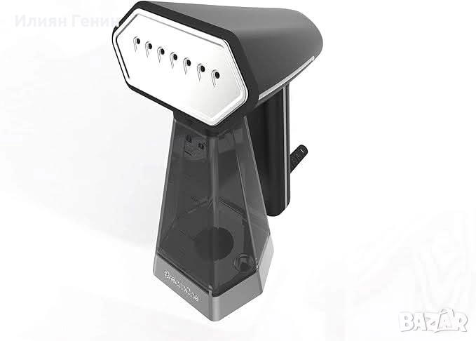 Висококачественият пътнически гладач с пара с хромирано покритие, матова сатенена повърхност и подсветка се предлага с вендуза с кука за окачване на дрехи, чанта за транспорт, четка за дрехи и универсален конектор за бутилка. Това улеснява изправянето и освежаването на дрехи.