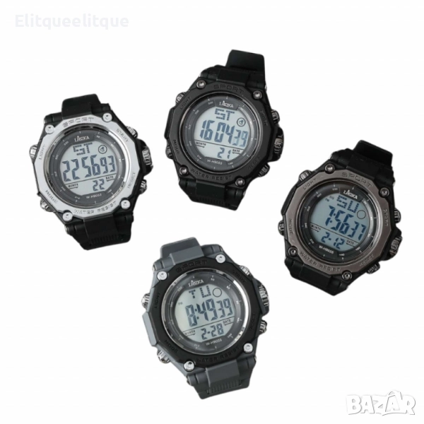 Механизъм: Дигитален; Показания: Час, минути, дата, ден от седмицата; Допълнителни функции: Хронометър, аларма, обратно броене, осветление; Водоустойчивост: 30 метра (WR 30M); Корпус: Здрав и лек; Бутони: MODE, START, RESET; Размер на дисплея: Големи цифри за лесно разчитане; Подходящ за: Спорт, тренировки, ежедневна употреба; Цветови комбинации: Черен с черна каишка/Сребрист с черна каишка/Черен със сива каишка/Тъмно сив с черна каишка;
