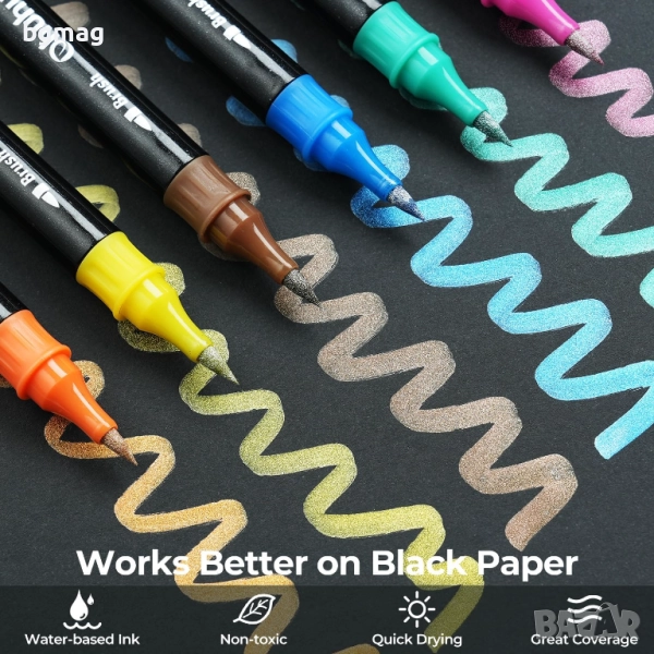 Ohuhu Metallic Marker Pens маркери/флумастери с два писеца тип четка и тънък писец, Ohuhu 24 цвята метален блясък с мастило на водна основа, за използване върху черно-бяла хартия, стъкло, камък, изработка на картички, скрапбук, великденски яйца, за Хелоуин, тиква, керамика, и много „Направи си сам“ проекти.
