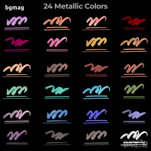 ✎ 24 ЯРКИ МЕТАЛНИ ЦВЯТА С 24 ярки блестящи цвята, писането, рисуването, декорирането, драскането, оцветяването и други със сигурност ще блеснат с тези маркери. 24-те цвята включват магента, кестеняво, ружово розово, светло лилаво, шисти сиво, тъмносиньо, тъмносиньо, средно синьо, небесно синьо, зелено, светло зелено, лимонено зелено, светло жълто, жълтокафяво, светло маслинено зелено, златисто, светло оранжево, червеникавокафяво, тъмно розово, средно сиво, бяло и черно.