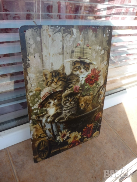 Метална табела котета котенца цветя саксия разни количка сладки сладички шапки декорация