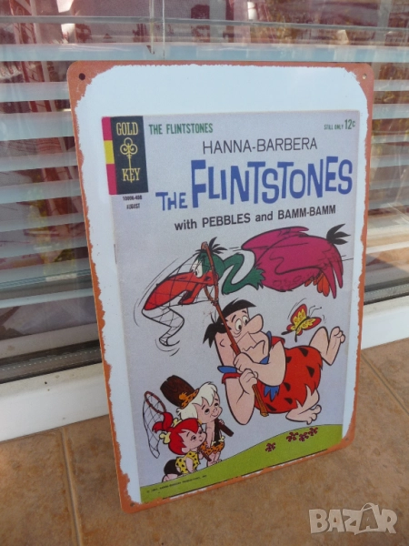 Метална табела Семейство Флинстоун Фред анимация Пебълс Бам Бам анимация динозаври каменната ера