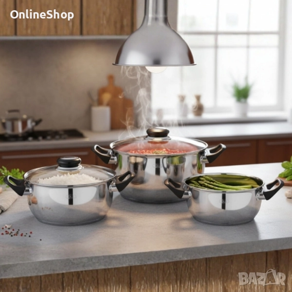 Комплектът залага на чист, модерен вид с лъскава метална визия, която стои добре във всяка кухня – от минимализъм до класика. Компактните дръжки и стабилните капаци осигуряват удобен захват и сигурност при пренасяне от котлона до масата. Визуално трите тенджери са хармонично „семейство“ – изглеждат еднакво стилни, просто в различни размери. Снимката показва гладка, лесна за почистване повърхност и капаци с удобни топчести дръжки за безопасно вдигане по време на готвене.