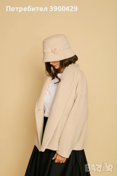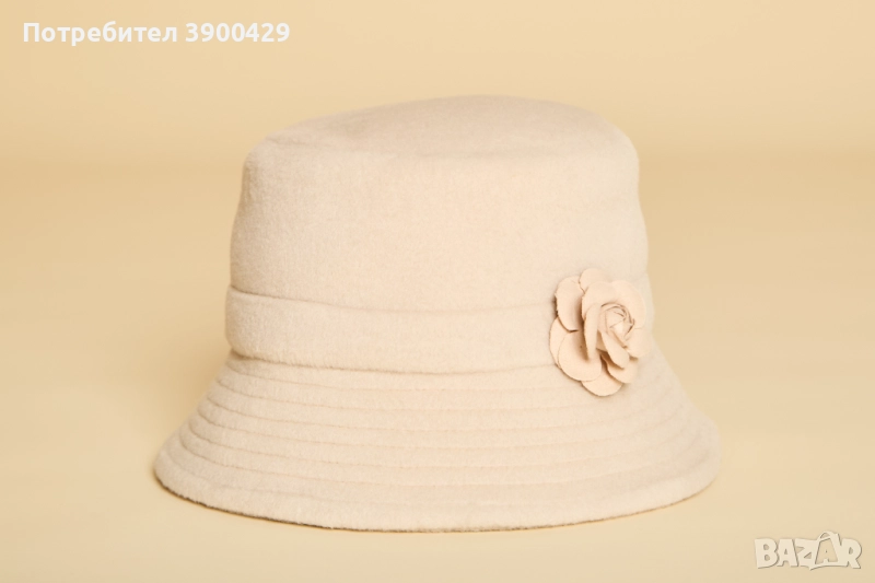 Класическа и елегантна, шапката - Bucket е изработена от вълнен плат с акцент от ръчно декоративно цвете.