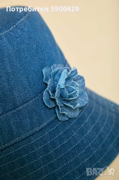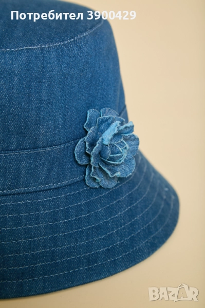 Класическа и елегантна, шапката - Bucket е изработена от памучен деним с акцент от ръчно декоративно цвете.
