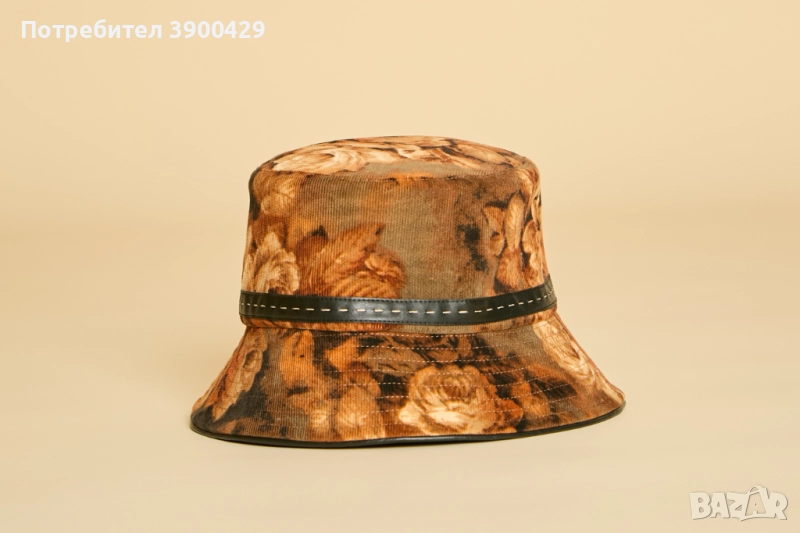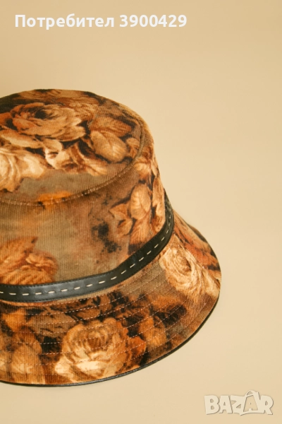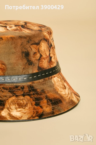 Класическа и елегантна, шапката - Bucket е изработена от памучно кадифе с красива есенна щампа.
