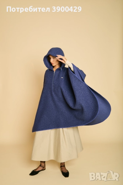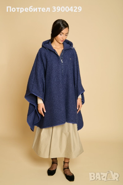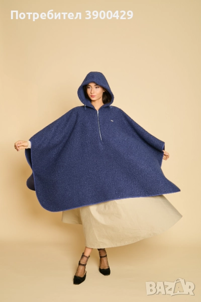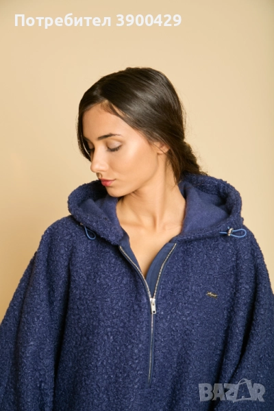 Зимна пелерина, изработена от вълнено букле, със свободна кройка, метален цип в предната част и регулируема качулка.