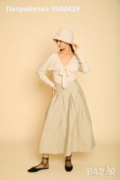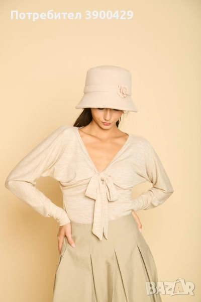 Нежна вълнена блуза, с красиво оформено деколте, което се регулира с помощта на връзки.
