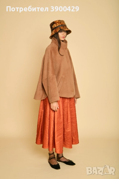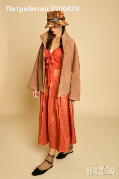 Палтото е подплатено, а закопчаването му е със скрити копчета в предната част.