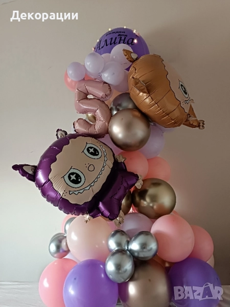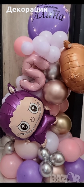 изработка на празнична украса с балони на различна тема.Украсата е висока около 150 см и включва балони,фигурка балон,балон цифра,име и светлини .Цена 70 лв