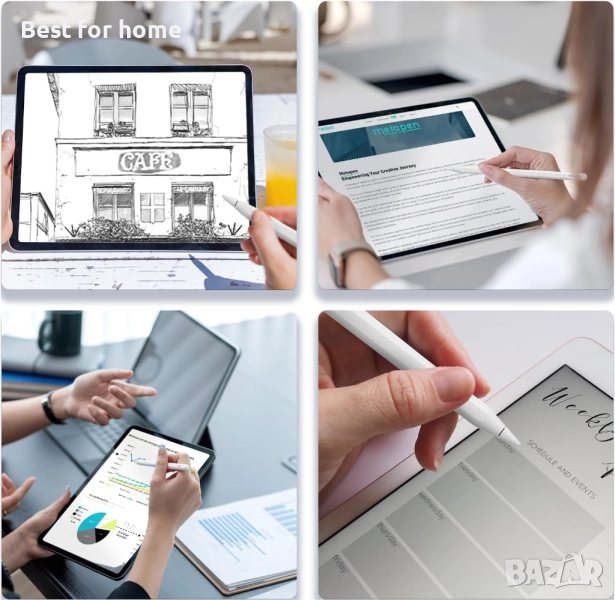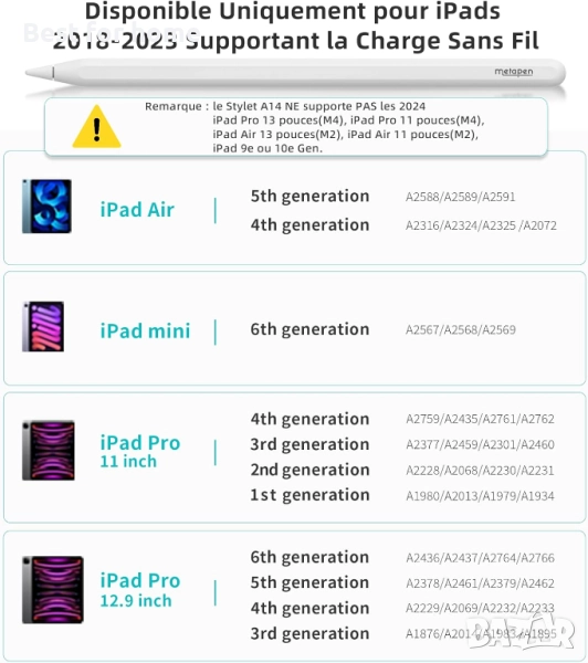 Apple Pencil 2-ро поколение и работи само с iPad Pro 12.9 инча 6-то/5-то/4-то/3-то поколение; iPad Pro 11" 4-то/3-то/2-ро/1-во поколение; iPad Air 5-то/4-то поколение; iPad Mini 6-то поколение.