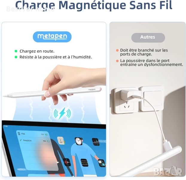 【Безжично магнитно зареждане】С metapen A14 просто трябва да го прикрепите магнитно към вашия iPad и той започва да се зарежда безжично. Кажете сбогом на тревогата за батерията и липсата на стилус. metapen iPad Pencil A14 е идентичен с