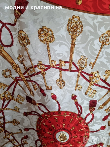 Разкошен, голям шал, изработен от плътна, лъскава и гладка коприна. Наситени тонове в червената гама. Фонът е с ефектни орнаменти в екрю с деликатно бляскав ефект.