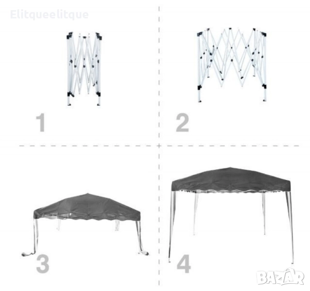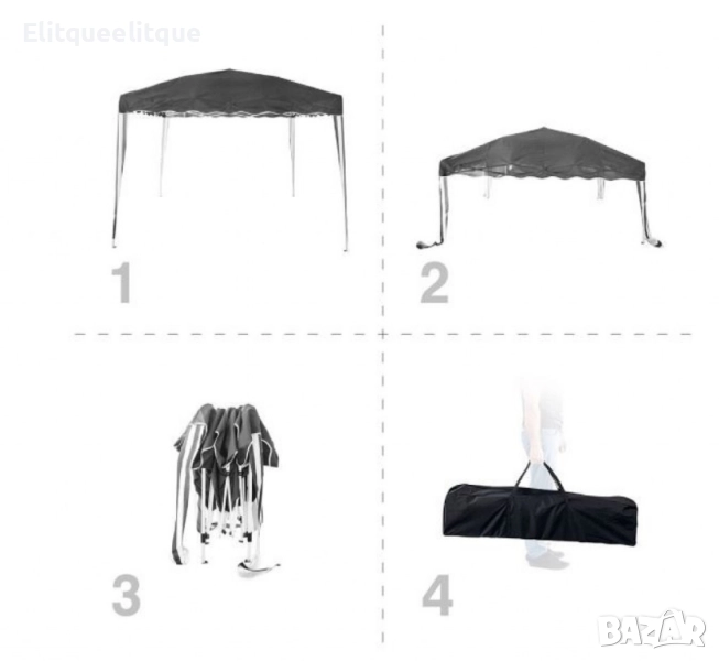 Марка: Muhler; Модел: Сгъваема шатра 300х300xH260 cm; Размери: Дължина: 300 см/Ширина: 300 см/Височина: 260 см; Цвят: Сив; Материал – покрив: Полиестер 180 g/m²; Материал – странични стени: Полиестер 140 g/m²; Стоманени тръби 40x40x0.7 мм (основна рамка); Стоманени тръби 18x18x0.6 мм (вътрешна структура); Тип конструкция: Сгъваема (pop-up механизъм); Устойчивост: Вятър, слънце, лек дъжд; Лесен монтаж/демонтаж: Без нужда от инструменти; Приложение: Градина, двор, изложения, пазарни щандове, къмпинг, събития;
