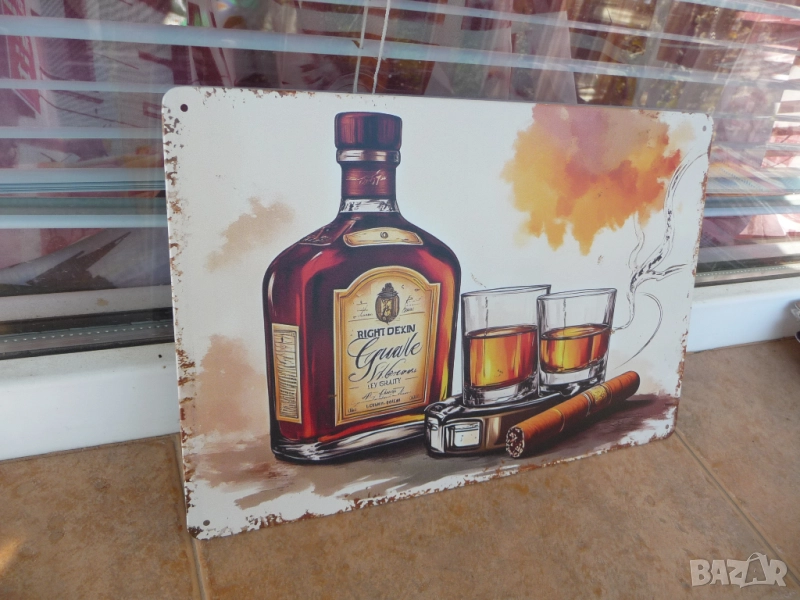 Метална табела уиски бутилка пура цигара мъжка бърлога бар отлежало пепелник дим баровци приятели