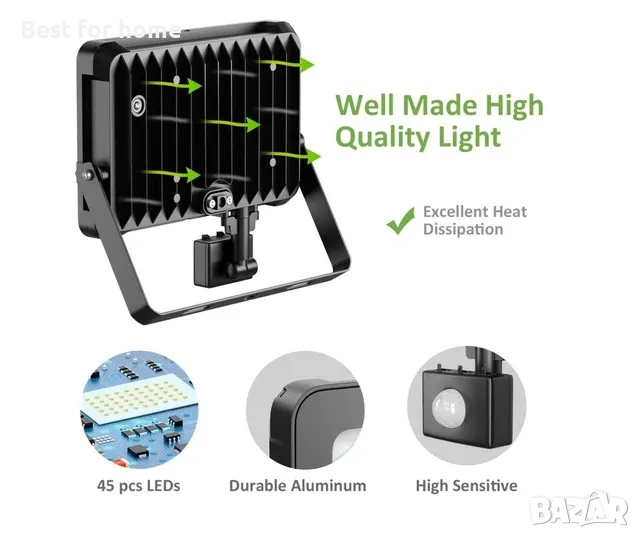 ДАТЧИК ЗА ДВИЖЕНИЕ - Прожекторът ще работи, само когато пред него има движение; СЕНЗОР ЗА СВЕТЛИНА - Може да се настрои да работи само през нощта или през целия ден; РЕГУЛИРАНЕ НА ЧУВСТВИТЕЛНОСТТА - Позволява настройка на обхвата и ъгъла на засичане;