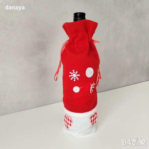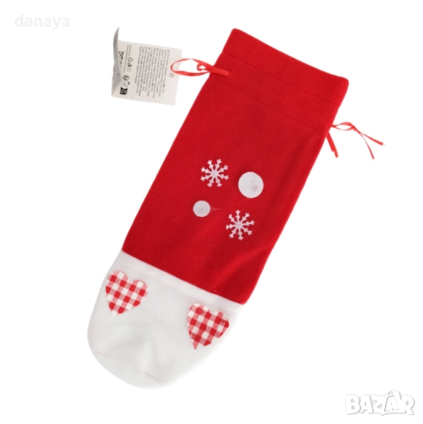 Изработен от мек полар в класическо червено и бяло, с апликации на снежинки и сърца в каре десен, той превръща обикновената бутилка във впечатляващ коледен акцент.