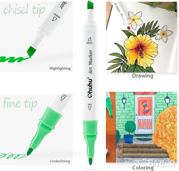 Маркери Ohuhu Fine Art 48 цветни маркери с мастило на алкохолна основа, с двоен връх "Chisel" & "Fine" (длето и фин) за деца, възрастни, художествен маркер за оцветяване и илюстриране.