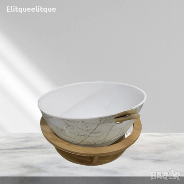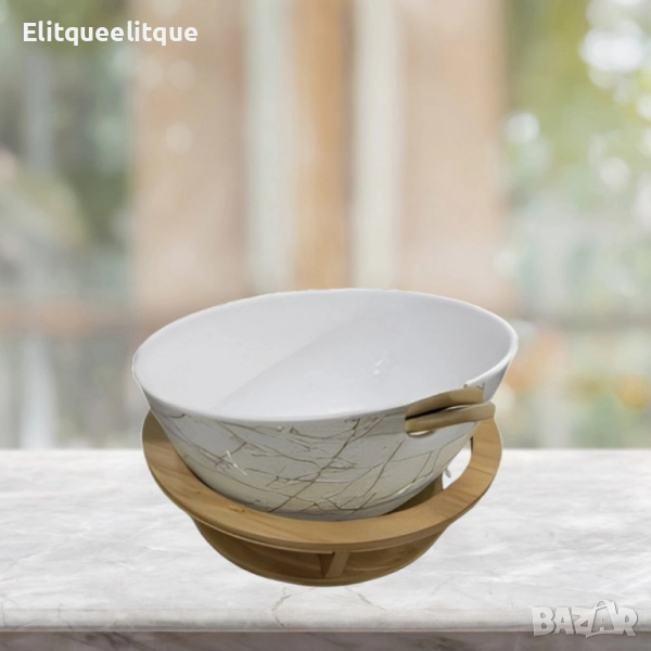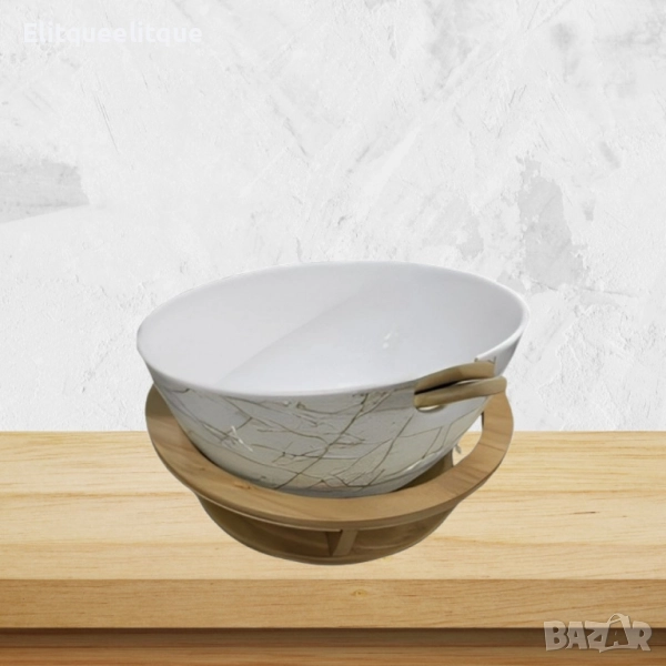 Материал на купата: висококачествена керамика; Материал на стойката: естествено дърво; Цвят на купата: Бяло с мраморен ефект и златисти акценти; Подходяща за съдомиялна (само купата); Не се препоръчва използване в микровълнова (заради златните нишки).