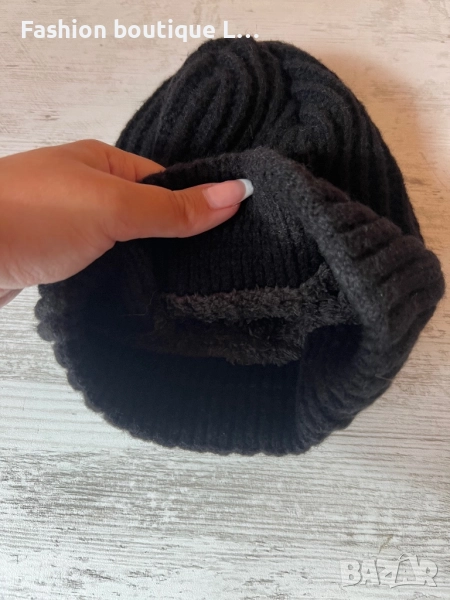 Черна дамска плетена зимна шапка с дебел плюш отвътре и снежинка отпред с надпис спорт 🖤🖤🖤 → Обява 52186467