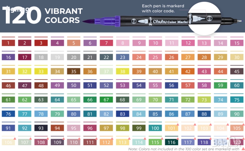 Ohuhu Maui Series маркери с два писеца тип четка и тънък писец, Ohuhu 120 цвята, с мастило на водна основа, смесваеми цветове, четка и тънкописец с фин връх, идеални за рисуване, калиграфия, рисуване на манга, планиране, дневници, изобразително изкуство, надписи с четка и много други творчески дейности свързани с рисуването.