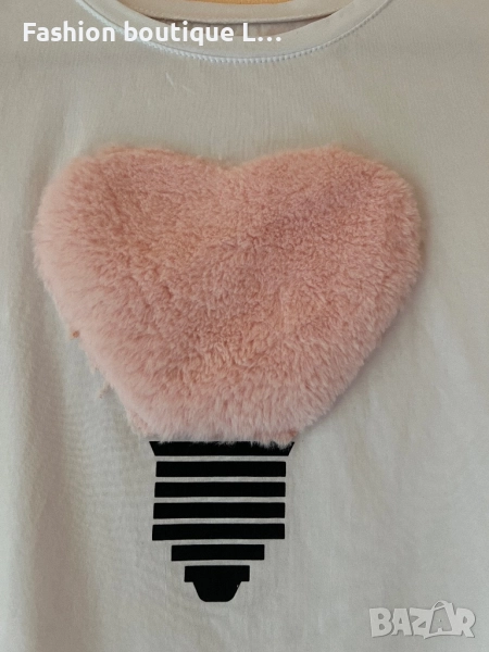 Бяла тениска с пухено розово сърце 95% памук 5% еластант S / M размер 🤍🩷🤍🩷🤍🩷🤍 → Обява 52186641