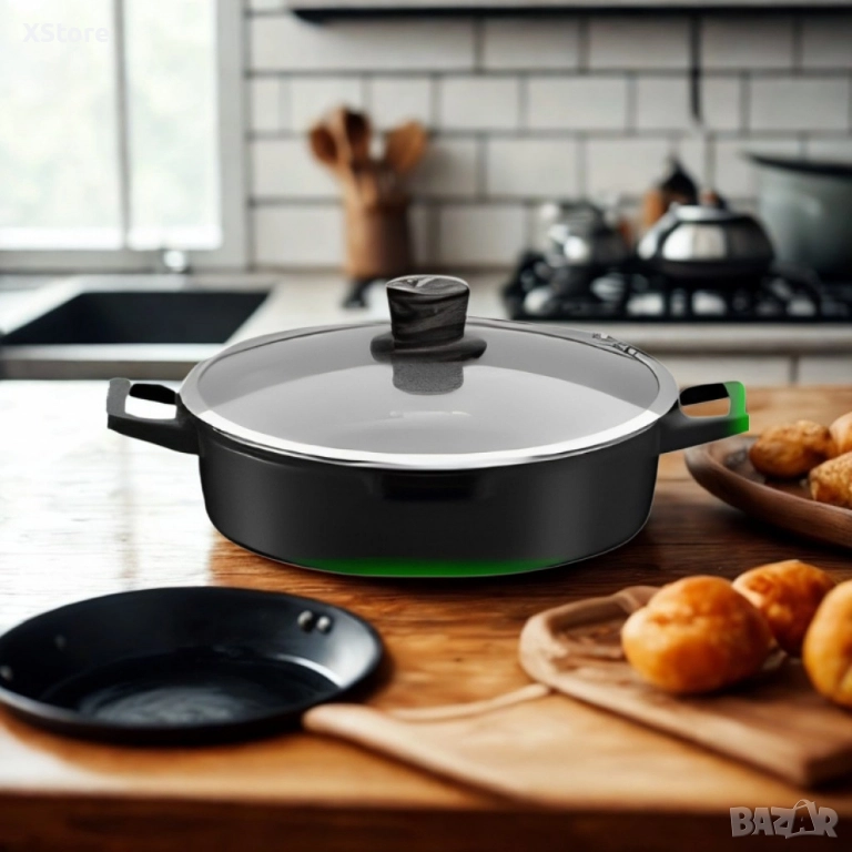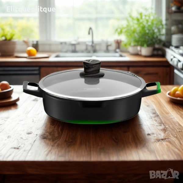 Марка: Lexical; Серия: ECO SMART; Тип: Ниска касерола с капак; Размер: 44 см; Вместимост: 2 литра; Материал на тялото: Лят алуминий (Die-Cast Aluminium); Покритие: Гранитно, незалепващо; Капак: Стъклен, с ергономична дръжка; Дъно: Индукционно – подходящо за всички видове котлони; Устойчивост: На високи температури и надрасквания; Лесна поддръжка: Подходяща за съдомиялна машина.