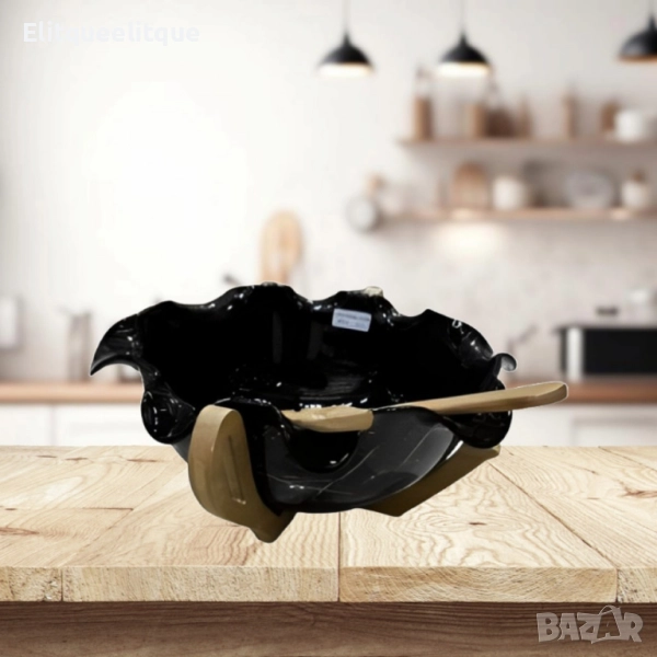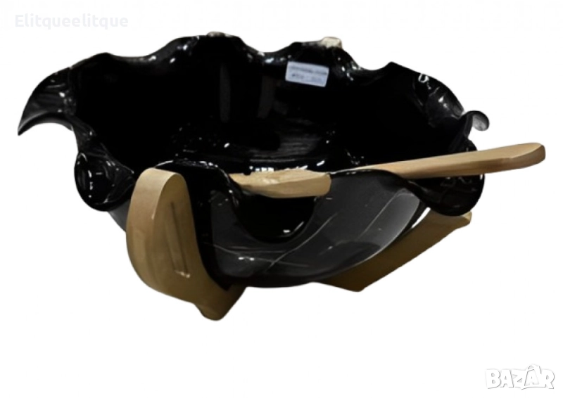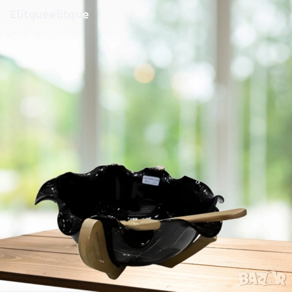 Материал на купата: устойчив полимер или стъкло с висок гланц; Материал на стойката и лъжицата: естествено дърво; Цвят: черен (купа), натурално дърво (стойка и лъжица); Подходяща за сухи храни и сервиране.