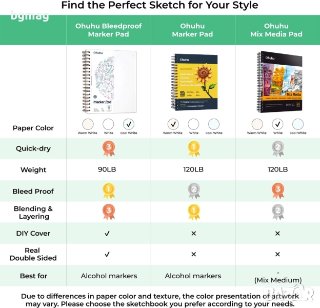 - ХАРТИЯ ЗА ХУДОЖЕСТВО БЕЗ КИСЕЛИНИ С МАКСИМАЛНА СПОСОБНОСТ НА СМЕСВАНЕ Запазете творбите си страхотни за години напред, тъй като е 100% без киселина. Дори по-добре, тази подложка за маркери е специално проектирана за използване с маркери Ohuhu, за да позволи безпроблемно смесване! Идеален за ученически пособия или коледни подаръци.