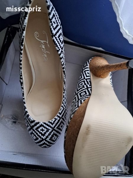 обувки на ток, нови. Стилни и подходящи за различни поводи. Плетени в черно и бяло. Платформата и тока са облечени в корк.