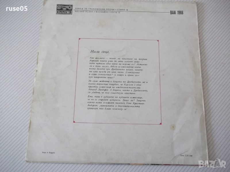 Грамофон.плоча"Дребосъчето и Карлсон който живее на покрива" → Обява 52186902