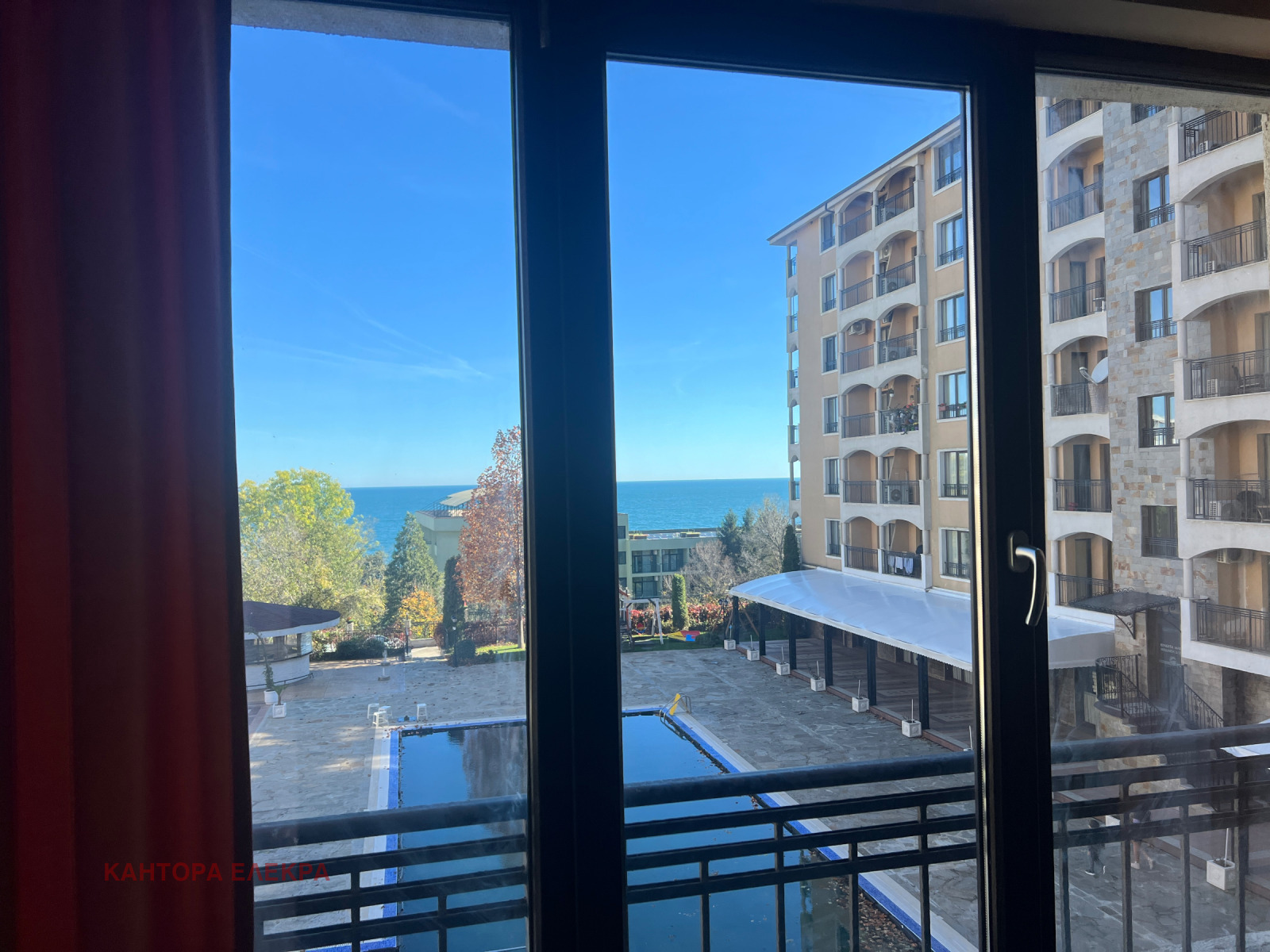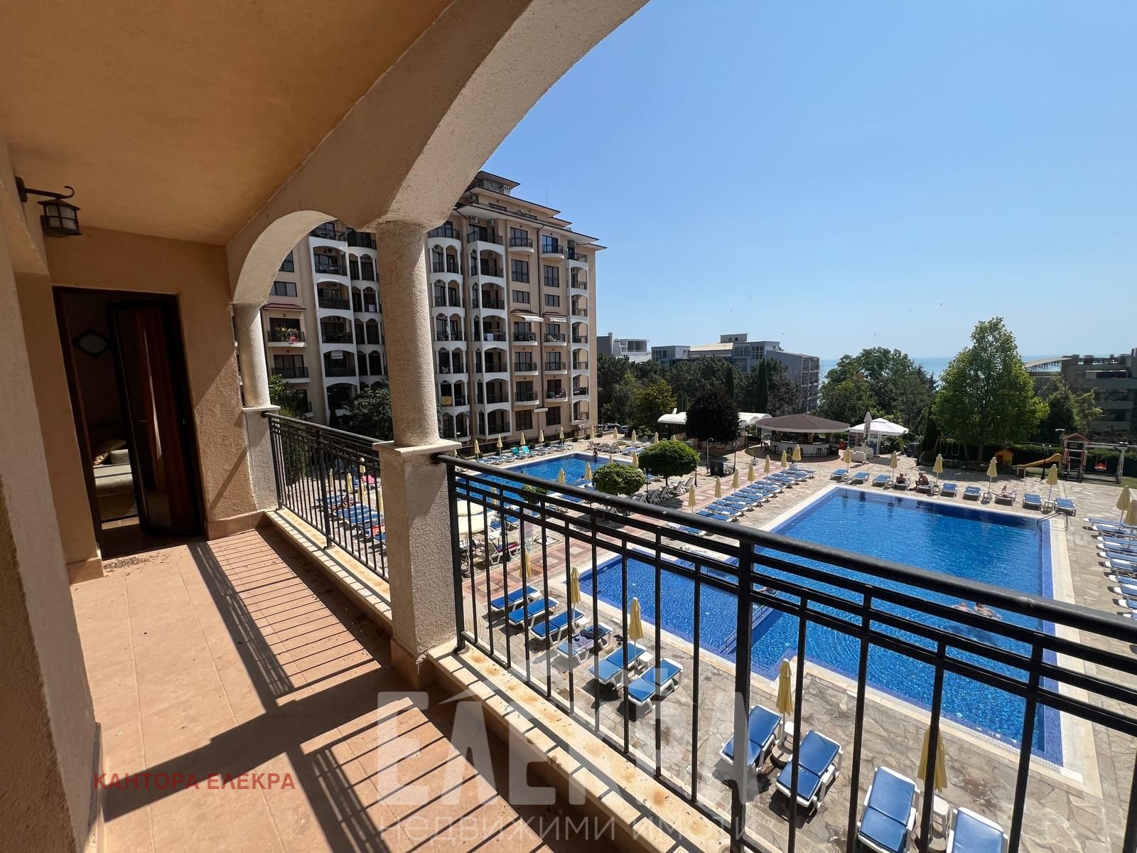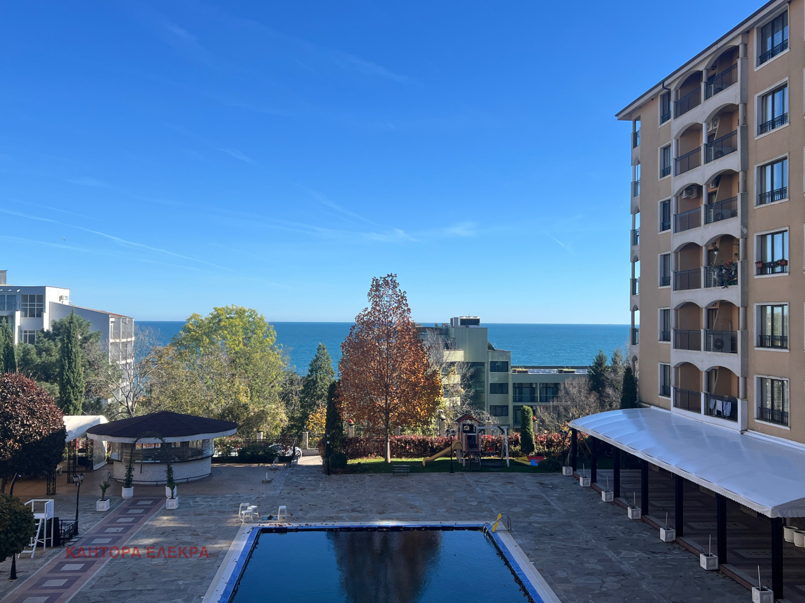 Апартаментът е разположен на 3-ти етаж в 6-етажна сграда и се състои от антре, тоалет,дневна с кухненски бокс, баня с тоалетна и душ, спалня, втора спалня и тераса с гледка към море и басейн. Напълно обзаведен и оборудван с климатик, хладилник, пералня, телевизори, кухненски бокс. Готов за нанасяне веднага!