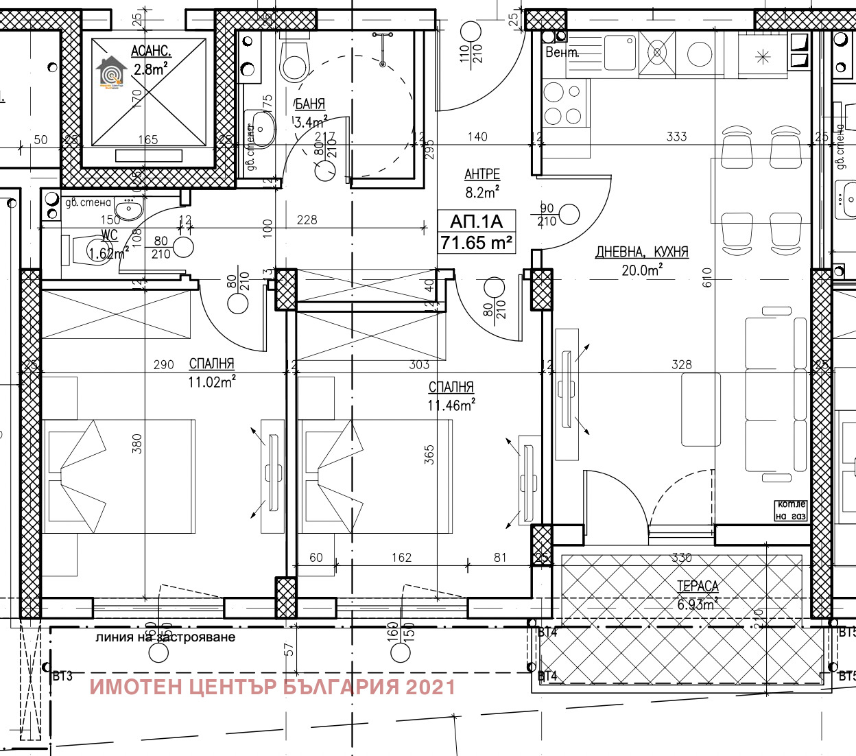 - Апартамента се състои от коридор, дневна с кухненски бокс с излаз на тераса, две спалня, баня с тоалетна и мокро помещение.
