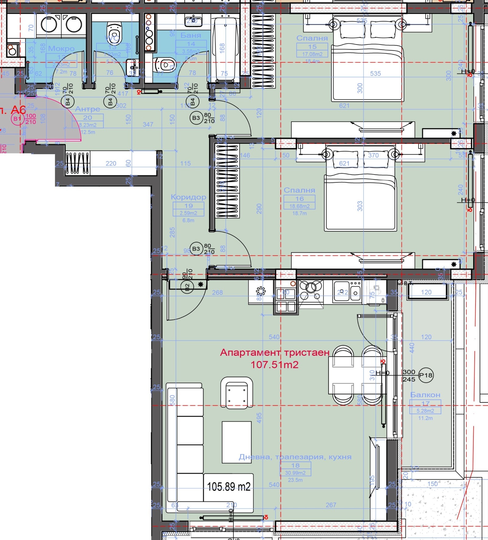 Апартамент А6 се намира в сграда А на трети етаж, с чиста площ от 107,51 кв. м. , а с общите части е 120,67, със следното функционално разпределение: антре с площ от 8,23 кв. м. , коридор с площ от 2,59 кв. м. , дневна, трапезария и кухня с обща площ от 30,99 кв. м. с излаз на тераса с площ от 5,28 кв. м. , две спални с площ от по 18,68 кв. м. и 17,08 кв. м. , баня с тоалетна с площ от 3,58 кв. м. , отделно друга тоалетна с площ от 1,93 кв. м. и мокро помещение с площ от 2,53 кв. м.
