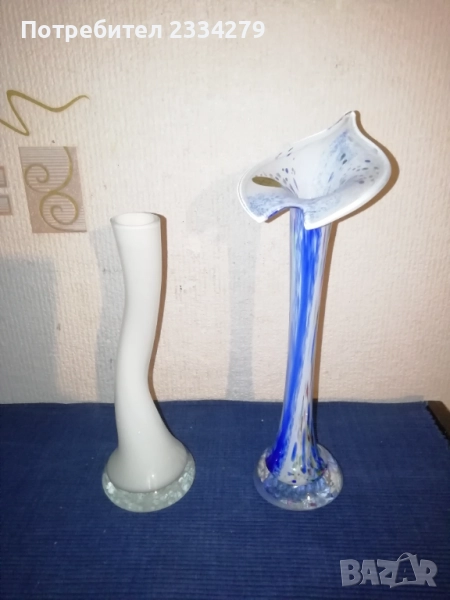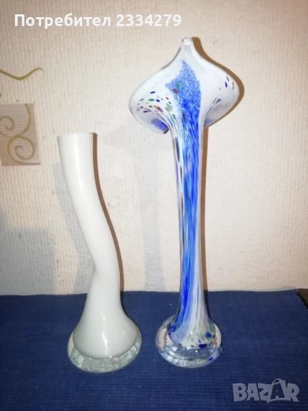 Старо духано стъклено изкуство от кристално цветно стъкло МОРАНО Стил, всичко е ръчно изработено в стъкларски заводи и ателиета в различни години и различни държави. N:1 ваза авторска ,,Гъша шия" 1970год. West Germani, цветно стъкло,,морано" размер 20х7см.,цена 5€.; N:2 кошник голям кристален с орнаменти и изобразена,,Ренесансова жена с