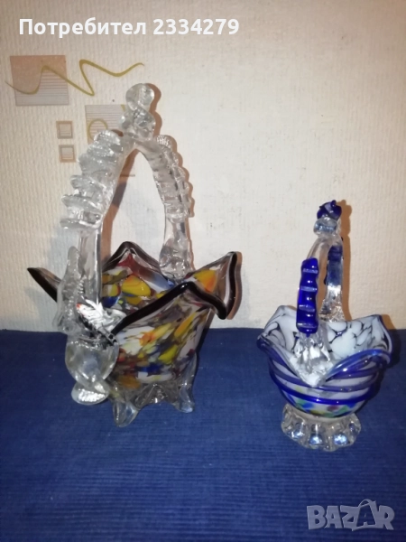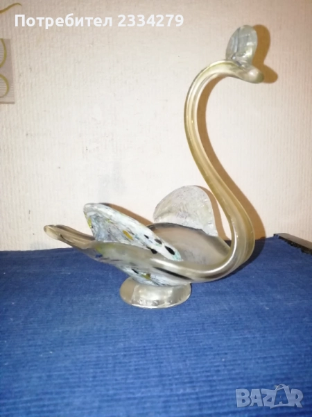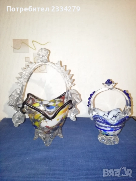огледало", размери 28х20х16см., цена 15€.; N:3 ръчна изработка на кошница цветно духано стъкло морано изработено през 70-те години в стъкларски завод,, В.Коларов" Сливен, размери 23х18х13см., цена 13€.; N:4 малка кошничка кристално стъкло МУРАНО, размери 16х11х9см., цена 10€.; N:6 цветно стъкло, ръчно изработен,, Лебед", размери 19х17х12см., цена 8€.