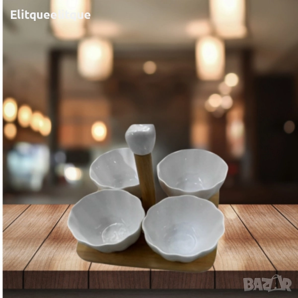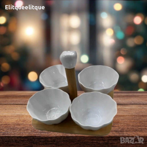 Материал на купичките: Керамика; Материал на стойката: Дърво; Брой купички: 4 броя; Размери (приблизителни): Всяка купичка побира около 100–150 мл; Централна дръжка за лесно пренасяне; Подходящ за ежедневна и официална употреба.
