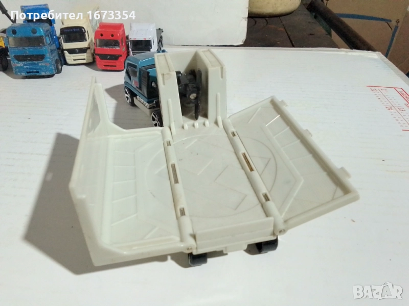 3)Мерцедес АКТРОС два броя ,големия платформа автовоз в лошо състояние ( ожулен и нарушена боя)+ АКТРОС влекач поставен на платформата
