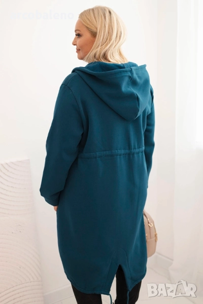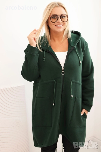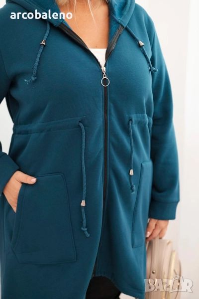 Изработена от мек материал с преобладаване на памук, тя гарантира приятна топлина и комфорт през целия ден. Качулката с връзки за стягане и големите джобове с нашивка добавят функционалност и спортен характер. Дължината под ханша визуално изтънява силуета и придава на облеклото оригинален характер.