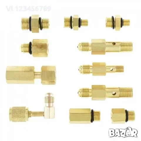 - адаптери: универсален Т с диаметър 8 и 10 мм, връзка тип ела 6 мм, 2 маркуча за свързване с маншет 6 и 8 мм, 3 маркуча със специални връзки за свързване към горивни рампи - бензин, комплект от 3 връзки към кран за свързване на манометъра към входа на инжекционната помпа, коляно на 90 градуса за трудно достъпни места, включва и адаптера за VW TDI тандемни помпи на M12x1.5mm според демонстрационната снимка.