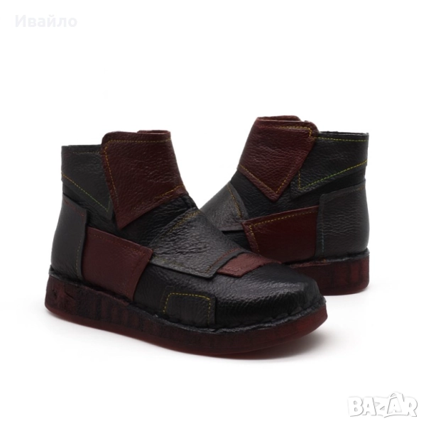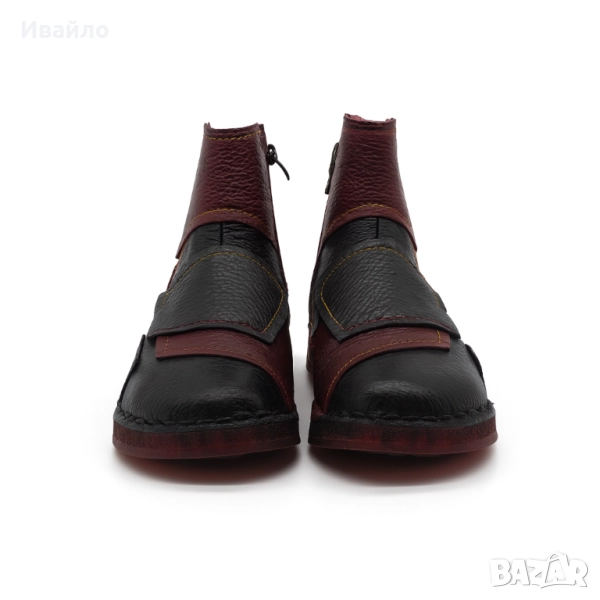 Дамски боти от естествена кожа в черно и бордо с креативен панелен дизайн → Обява 52190146