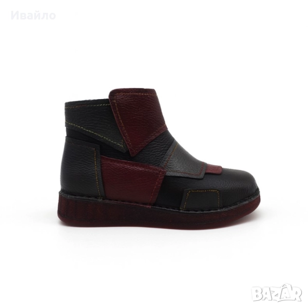 Дамски боти от естествена кожа в черно и бордо с креативен панелен дизайн
