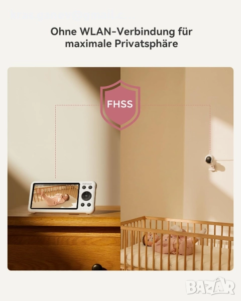 Двойна връзка (WLAN/LAN) – винаги с вас: Използвайте специалното родителско устройство за надеждно домашно наблюдение или следете картината на живо чрез приложението Momcozy в движение. Съвременното криптиране гарантира, че предаването на видео от вашия бебешки монитор остава безопасно и поверително - за успокояващ фокус върху вашето дете.