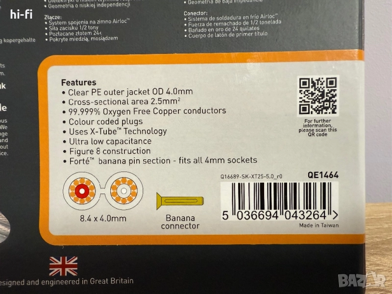 кабели за тонколони QED XT25 с дължина 2 х 5м., фабрично терминирани с Qed Airloc Heat Shrink 4mm Banana Plugs.