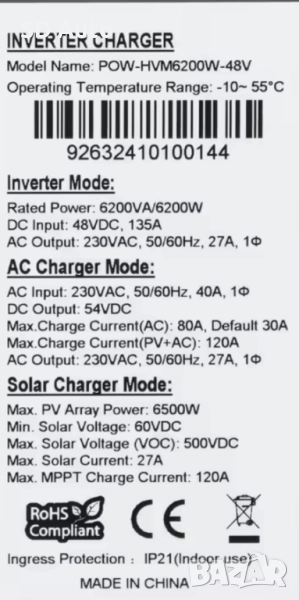 соларен инвертор 6,2kW/48V c 230 V /50 Hz чиста синусоида POW-HVM6200W-48V