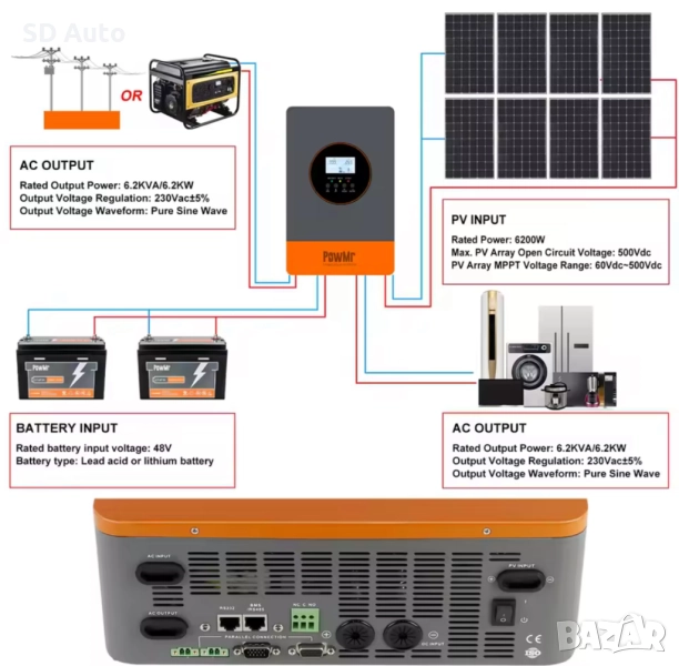 Хибриден инвертор Pow Mr - 6,2 Kw / 48V