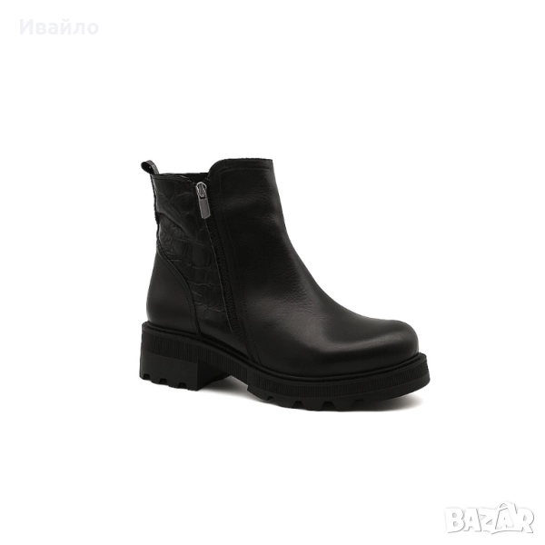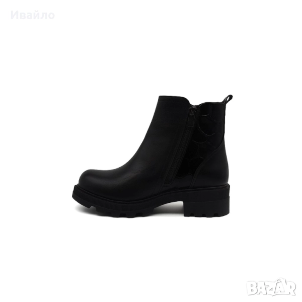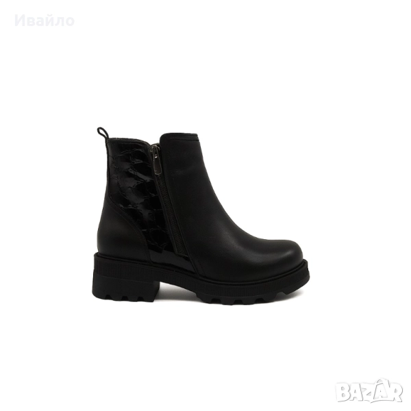 Гладката матова предна част е елегантно допълнена от лъскава, релефна текстура в задната зона, която придава акцент и отличителен стил. Практичният страничен цип осигурява удобно обуване, а стабилната подметка с грайфер предлага сигурност и сцепление при всякакви условия.