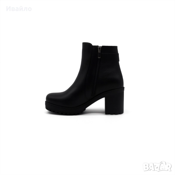 Тези стилни дамски боти от естествена кожа в класическо черно са създадени за жени, които търсят елегантност, стабилност и комфорт в едно. Моделът се отличава с изчистен силует, висок ток и фина метална катарама около глезена, която придава луксозен акцент.