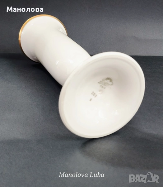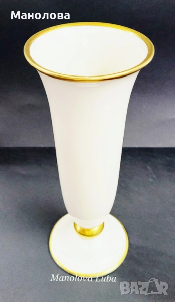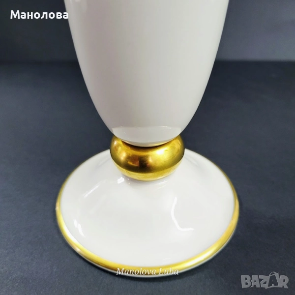 В цвят екрю и елегантна форма, акценти с истинско златно покритие, вазата е в безупречно антикварно състояние.